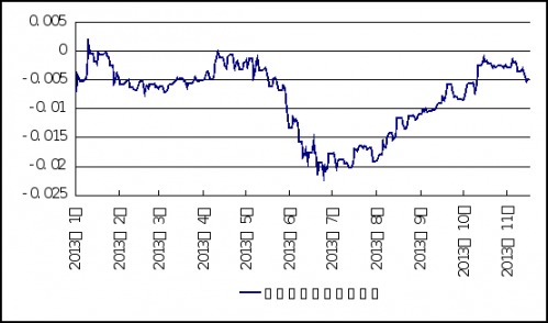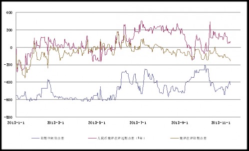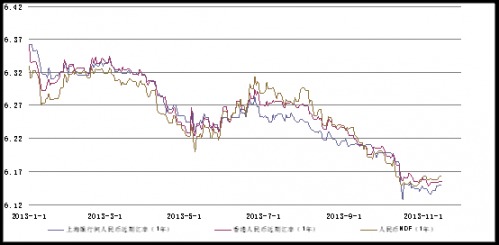北京(CNFIN.COM / XINHUA08.COM)--當周(11月11日-11月17日)當周,人民幣兌美元中間價與即期價格未能保持一致趨勢:中間價先漲后跌,周四一度觸及6.1315,創2005年匯改以來最高紀錄,然而全周累計僅上行4個基點;而即期匯價方面,市場謹慎情緒濃厚,全周累計下行17個基點?人民幣遠期價格一改上周升勢,全線走跌,但跌幅於后半周有所放緩?1年期NDF與人民幣中間價計算所得幣值預期由上周的(-0.37%)轉至(-0.47%)?從市場整體情況來看,當周市場一直等待著十八屆三中全會的政策方向,交投心理謹慎,盤整態勢明顯,且即期價格在6.09元遭遇較大阻力?預計在三中全會改革方案細節出爐之前,盤面可能繼續維持窄幅波動?