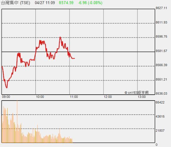 台股早盤量縮一度跌破8400點而後翻紅,盤中高見8437.13點距離前波高點8439點咫尺。19大類股盤中成交比電子62.9%、電機機械4.33%、金融3.5%、生醫3.17%;隨距離農曆年時間逼近,觀光概念股早盤漲勢強勁,太陽能股個別表態;台積電一度反彈0.48%,鴻海漲0.77%,台50指數漲0.16%,台達電漲2.85%;隨「雙卡金檢」全面啟動消息,金融股今天量縮走勢偏弱,金融保險盤中跌0.24%是拖累大盤的因素之一。