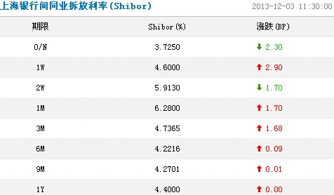 上海銀行間同業拆放利率(Shibor)顯示,短期利率方面,隔夜利率跌2.3個基點,至3.7250%;7天期利率漲2.9個基點,至4.6000%;14天期利率跌1.7個基點,至5.9130%;1個月期利率漲1.7%,至6.2800%。