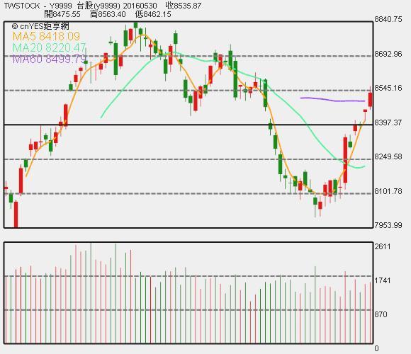 台北股市5月30日集中市場由多頭控盤的格局收盤加權股價指數出現上漲72.26點或0.85%,收盤報8535.87點,市場成交值769.62億元;在國際財金利空逐漸淡化及技術指標周KD、月KD翻揚向上的有利多頭控盤格局下,台股在今天將收的月線也可望由另一輪續攻而收紅。