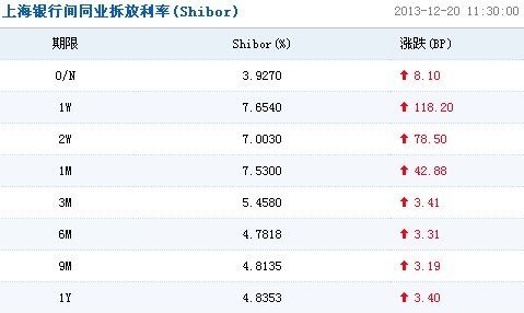 上海銀行間同業拆放利率(Shibor)顯示,短期利率方面,隔夜利率漲8.1個基點,至3.9270%;7天期利率漲118.2個基點,至7.6540%;14天期利率漲78.5個基點,至7.0030%;1個月期利率漲42.88個基點,至7.5300%。