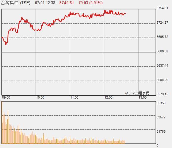 歐美股市持續反彈,美股昨日再以大漲235點作收,激勵台股持續強勢表態,加上外資期現貨同步做多,指數欲跌不易,今日預估量能達近900億元,權值股台積電大漲逾2%,中華電、台塑化、南亞與國泰金等都有逾1%漲幅,盤面上電子股領軍上攻,半導體多檔強勢表態,族群則以生技醫療表現最好,台股早盤開盤後持續穩步上攻,類股輪動帶動下指數順利衝上8700點,也收復上周五英國脫歐的黑K棒高點。
