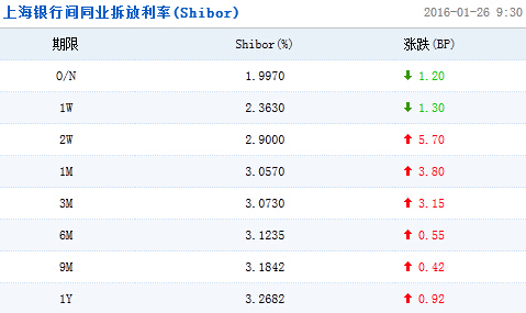 上海銀行間同業拆放利率(Shibor)顯示,隔夜Shibor報1.9970%,下跌1.20個基點;7天Shibor報2.3630%,下跌 1.30個基點;14天 Shibor報2.9000%,上漲5.70個基點;1個月Shibor報3.0570%,上漲3.80個基點;3個月Shibor報3.0730%,上漲3.15個基點。