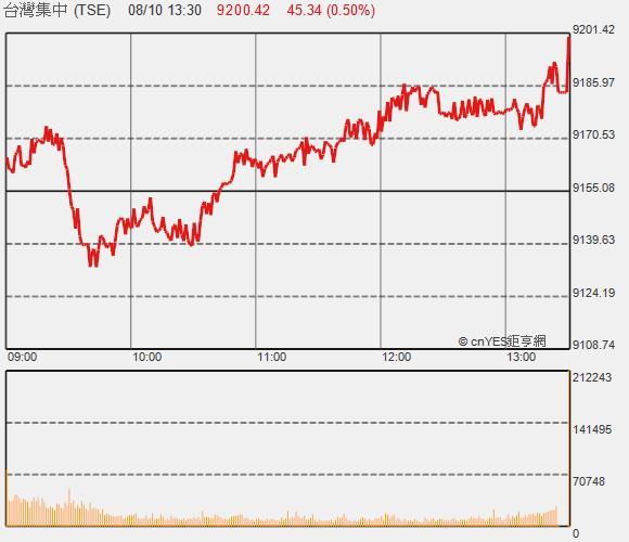 亞洲貨幣持續走升,激勵台股熱錢效應延續,早盤開平高後在平盤上下震盪,不過在高價股大立光、精測,權值股台積電、鴻海全面轉強後,指數順利翻紅,加上金融股也在尾盤出現拉尾,最後一檔拉高17點,終場上漲45.34點,以9200.42點作收,成交值793.69億元。