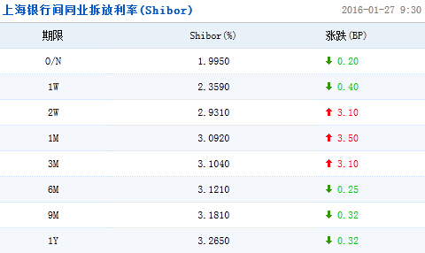 上海銀行間同業拆放利率(Shibor)顯示,隔夜Shibor報1.9950%,下跌0.20個基點;7天Shibor報2.3590%,下跌 0.40個基點;14天 Shibor報2.9310%,上漲3.10個基點;1個月Shibor報3.0920%,上漲3.50個基點;3個月Shibor報3.1040%,上漲3.10個基點。