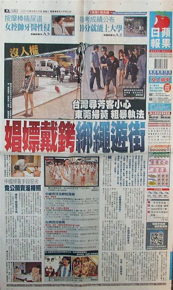 ◆蘋果日報:台灣尋芳客小心 東莞掃黃 粗暴執法 娼嫖戴銬 綁繩遊街