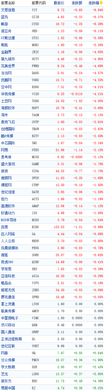 中國概念股周四收盤几乎全下跌,16支股票跌幅超3%,其中6支跌幅超5%。文思信息跌6.94%,藍汛跌6.37%,暢游跌6.26%,諾亞舟跌6.11%,UT斯達康跌5.56%,斯凱跌5.26%。此外,金融界、九城、完美世界、噹噹網、優酷網、空中網、華視傳媒、土豆網等8個股跌幅在4%至5%之間,海輝軟件跌3.66%,淘米網跌3.12%。