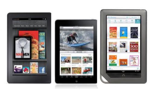 Kindle Fire (左)、iPad (中)、Nook Color (右)。