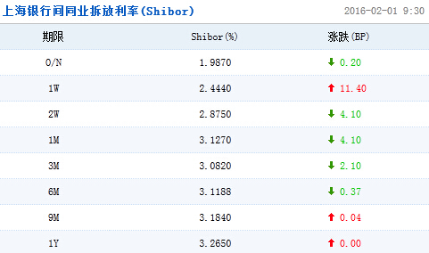上海銀行間同業拆放利率(Shibor)顯示,隔夜Shibor報1.9870%,下跌0.20個基點;7天Shibor報2.4440%,上漲11.40個基點;14天 Shibor報2.8750%,下跌4.10個基點;1個月Shibor報3.1270%,下跌4.10個基點;3個月Shibor報3.0820%,下跌2.10個基點。