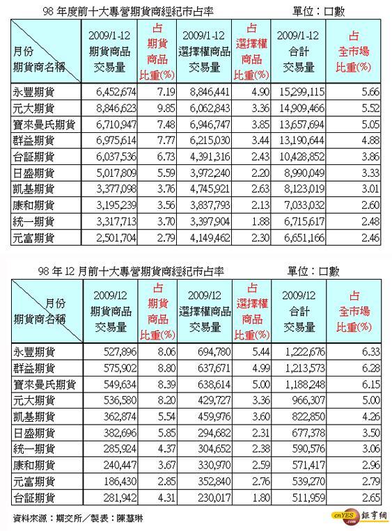 期交所依據2009年度專營期貨經紀商全年度經紀交易量除以全市場交易量(涵蓋經紀與自營交易量),計算全年度之十大專營期貨經紀商。根據統計,2009年度永豐期貨以5.66%的市占率居冠,元大期貨以5.52%的市占率居第二名,寶來曼氏期貨則以5.05%的市占率,位居第三名。另第四、第五名分別是群益期貨的4.88%及台証期貨的3.86%。