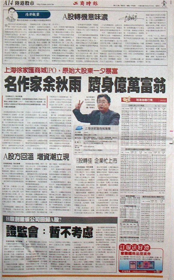 上海知名的百貨商城-徐家匯商城股份有限公司自15日開始公開發行股票(IPO),未來打算在中小板掛牌,其中原始大股東知名作家余秋雨未來的身價將會破億,成為中國的億萬富豪。