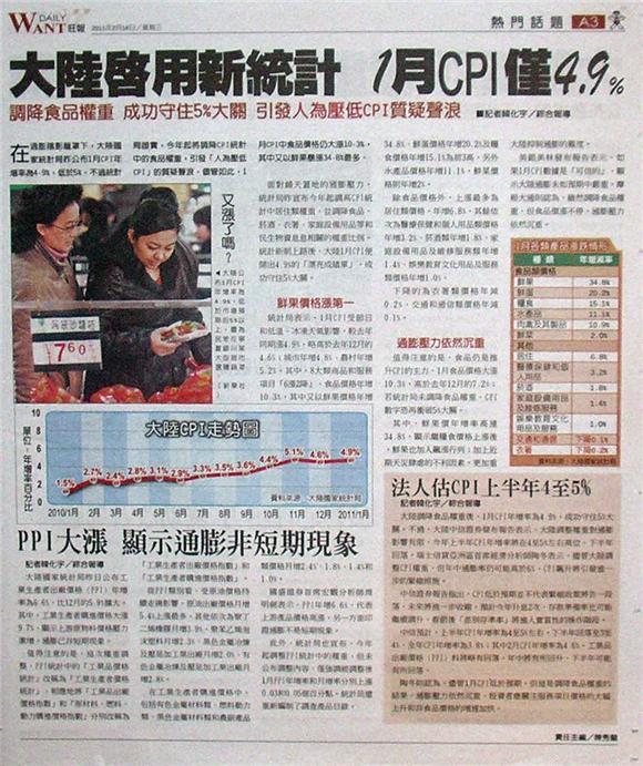 ■大陸啟用新統計 1月CPI僅4.9%
