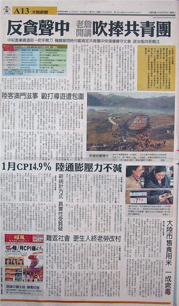 台灣主要報紙大陸版要聞標題一覽 (2月16日)