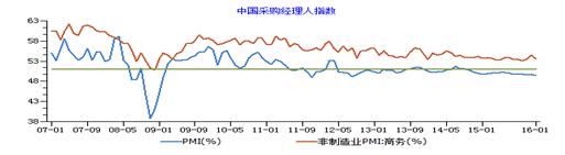 2月1日公布的1月官方pmi為49.40,預期49.6,前值49.7。官方制造業pmi自去年8月份以來,已經連續六個月處於衰退區間。我們認為,制造業pmi回落主要有三方面原因:一是從歷史數據上看,受元旦及春節臨近等因素影響,每年1月份制造業生產活動大多有所減少,市場供需放緩。生產指數為51.4%,比上月回落0.8個百分點;新訂單指數為49.5%,比上月下降0.7個百分點,落至臨界點以下。二是在當前化解過剩產能和去庫存階段,部分企業主動減少產量和降低庫存。產成品庫存指數為44.6%,比上月下降1.5個百分點,連續3個月回落。三是近期國內外經濟增長持續放緩,需求總體偏弱,進出口受到一定程度影響。新出口訂單指數和進口指數分別為46.9%和46.4%,比上月下降0.6和1.2個百分點,連續處於收縮區間。總體來看,受全球低迷的經濟環境影響,當前國內外需求始終不振,傳統制造業企業經營狀況仍有待進一步改善。年初部分大宗商品價格反彈帶動工業生產原材料價格回升,有利於緩解當前工業部門的通縮壓力,1月份的ppi數據降幅或有所縮窄。但目前新興市場工業的收縮還在持續,大宗商品長期弱勢不改。在2016年國內制造業去產能的過程中,中國經濟繼續下行。因此,市場將繼續震盪尋底。