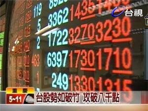 年關將近 台股表現越來越好!今天更是一舉衝破8000點, 早上一開盤就展現氣勢,開出8007點上漲54點,盤中一度上漲72點,最高站上8079點.總成交量為1395.77億元,以金融、營建類股表現最強,雖然尾盤漲勢稍歇,但終場站穩八千關卡 收在8057.49點,是一年半以來的新高點.