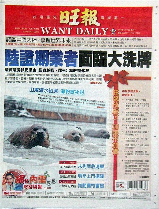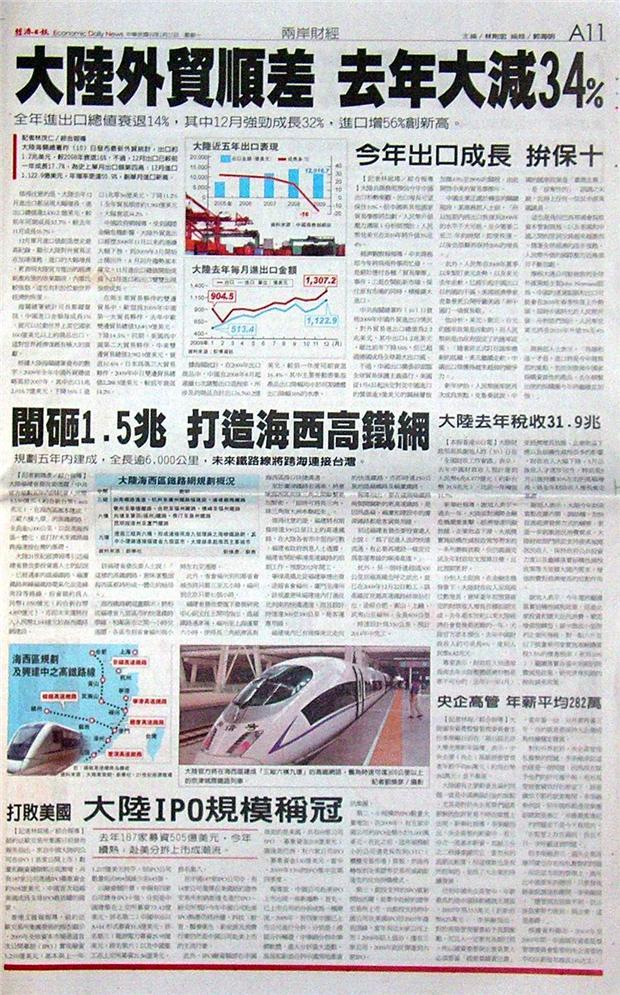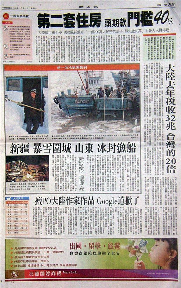 台灣主要報紙大陸版要聞標題一覽 (1月11日)