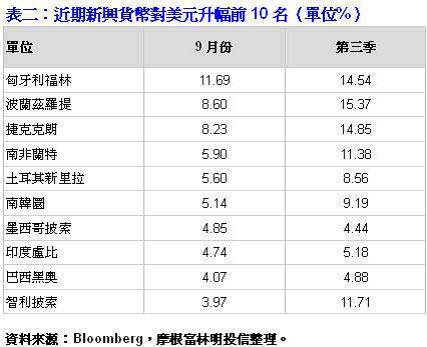 第二套量貨寬鬆政策造成美元近期急貶,以九月份兌美元升幅前10名的新興貨幣,歐非中東與拉美地區貨幣的升幅最強,有接棒亞幣強漲之力道,包括匈牙利、波蘭和捷克等,兌美元平均升值幅度近10%(見表二)。尤其在巴西石油增資案通過後,資金回補趨勢明顯。