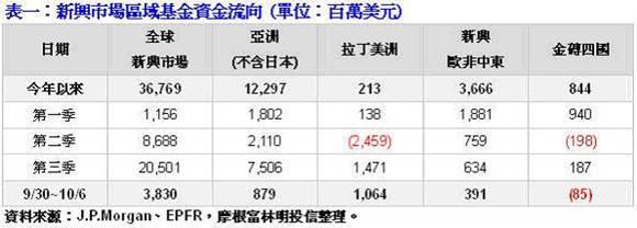 日本央行率先啟動第二輪寬鬆貨幣政策引爆資金出走潮,根據EPFR統計,新興股市連續19周吸金,單周淨流入38.3億元,再創2008年12月以來單周最大淨流入金額。再者,美元走貶趨勢帶動新興貨幣升值契機,9月以來,歐非中東,及拉美等地貨幣兌美元升值幅度明顯,吸引資金匯聚,新興拉美基金連8周淨流入,單周流入10.64億美元更創2008年新高;而歐非中東今年來淨流入金額達36.66億元,是三大新興市場中,唯一今年以來淨流入金額已超越去年者。(見表一)