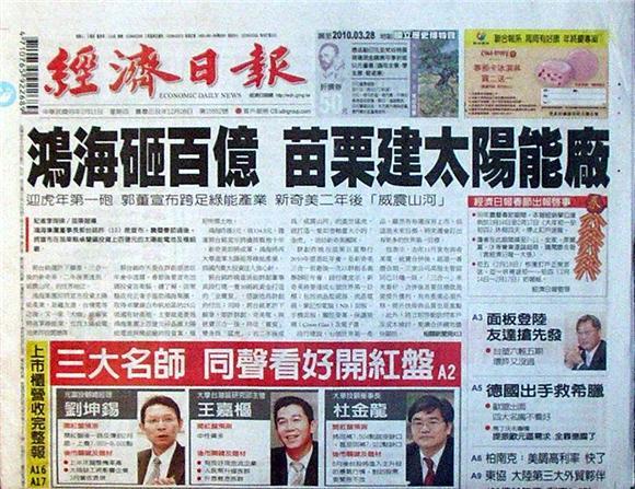 ◆經濟日報:鴻海砸百億 苗栗建太陽能廠
