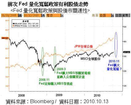 投資建議-預期歐美日的量化寬鬆政策將持續對市場帶來資金柴火,投資人可維持一定曝險部位!然而,由於此波漲勢主要來自資金面(而非基本面),除非近期經濟數據與財報亮眼,否則漲多資產在短期可能面臨回檔壓力。就上述提及的風險觀察而言,可留意QE2動向、各國(尤其新興國家)是否資本控制、股票本益比是否太貴、通膨疑慮是否高漲等。