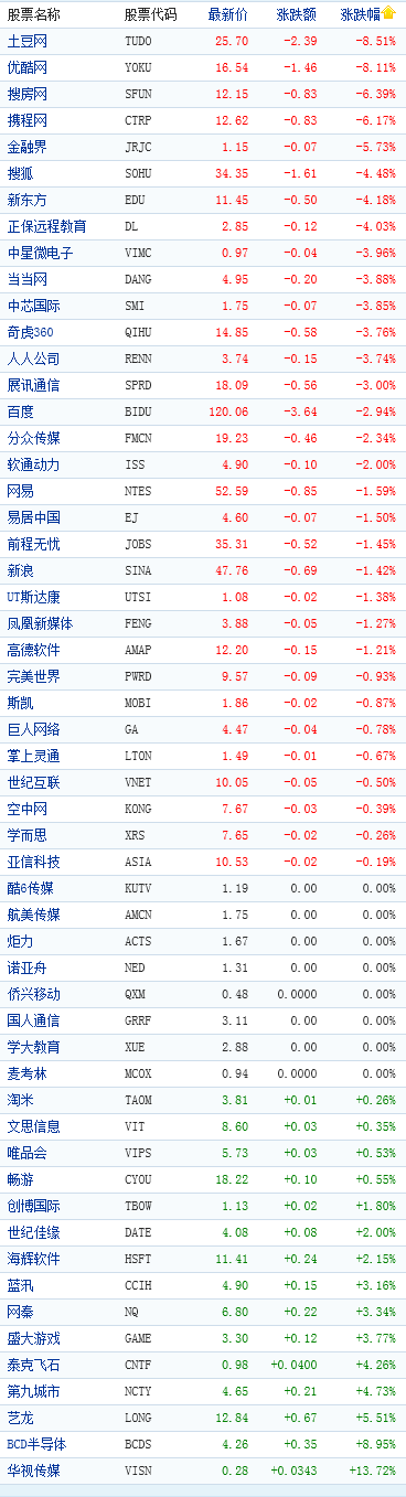 中國概念股周一午盤多數下跌 土豆優酷大跌8%