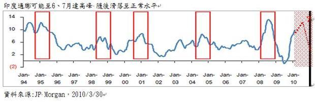 由於印度國內需求因景氣加溫而受提振,加上國際原物料由谷底翻揚,種種因素皆使印度通膨隱憂揮之不去,黃廷偉指出印度通膨可能於6、7月達到最高峰,其後將逐步回到正常水位,其主要原因有二,首先是過去一年由於印度氣候異常,出現季風雨季缺水情形,造成農作物大幅上漲,導致通膨增溫,而今年預期氣候將恢復正常,故可望緩解通膨現象。第二則是印度央行為抑制通膨而連續兩次升息,加上印度政府放手印度盧比升值,累計今年以來(截至2010/4/19),印度盧比對美元升值幅度已達4.01%,這些政策預期將逐漸顯現其效果,對於通膨將有降溫作用。