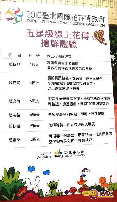 一直保持神秘感的花博,終於要開放讓民眾一睹為快,究竟花博哪裡好玩、好看? 14 個展館裡有哪些精采內容?台北國際花卉博覽會官網即日起,推出「線上花博」搶先體驗版,結合虛擬化技術與互動模式,用最簡易的方式,讓民眾先行瀏覽尚未對外曝光的花博園區及 14 座展館外觀。 》》2010年台北花博展:遊樂一覽