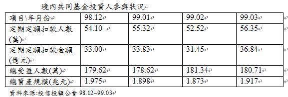 從境內基金總資產規模來看,3月份又回到1.917兆元,較元月及2月都有明顯成長,主要因素應是來自淨值的成長,造成總體規模增加,但受益人數的增長才是投資人參與市場的重要參考指標,今年3月份雖然小幅減少,但人氣是否開始退潮,仍待進一步確認,而定期定額一向是一般投資人最容易參與的投資方式,所以只要扣款人數持續增加,市場動能就不至於大幅減少。