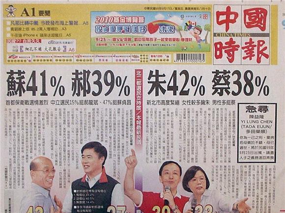 ◆中國時報:本報最新民調 蘇41% 郝39% 朱42% 蔡38%