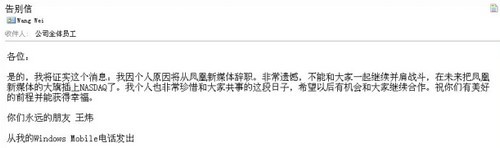 今日,王煒向鳳凰新媒體的全體員工發出告別信,正式公布自己即將離職的消息。王煒在信中表示,離職是因為自己的個人原因,並為沒有跟隨鳳凰新媒體一同登陸納斯達克而遺憾,但他沒有透露未來的計劃。