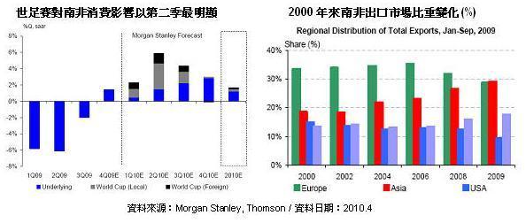 除世足賽外,原物料也是南非重要的投資題材。原物料出口持續扮演推升其經濟成長的重要引擎。南非出口商品中近60%為基本金屬、貴金屬和礦產相關,其中白金、黃金和煤就佔了近70%的商品出口。2009年起亞洲區域正式超越歐洲、成為南非最大的貿易夥伴,其中以中國成長速度最快,目前是南非最重要的出口對象(佔其總出口的9.4%),過去幾年南非與歐、亞間貿易活動的此消彼長,讓南非經濟成為歐非中東區域中,受歐洲經濟衰退影響較小的國家之一,同時又能受惠於亞洲經濟的繁榮,這提供未來南非經濟成長的基礎。