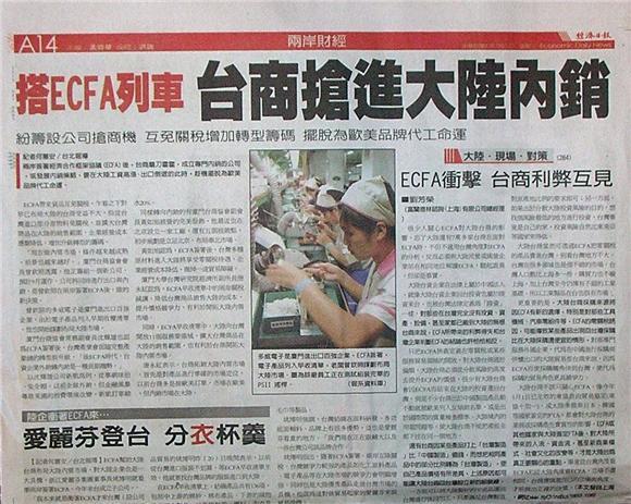 兩岸簽署經濟合作框架協議(ECFA)後,台商磨刀霍霍,成立專門內銷的公司,或發展內銷策略,要在大陸工資高漲、出口倒退的此時,趁機擺脫為歐美品牌代工命運。