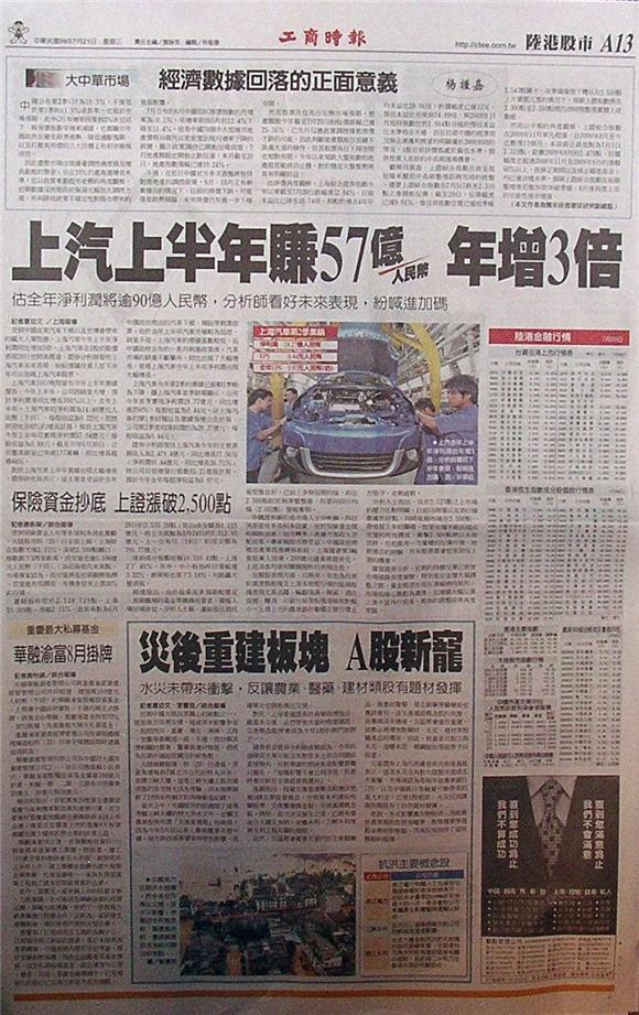 受到中國政策汽車下鄉以及世博會帶來的龐大人潮效應,上海汽車今年上半年淨利潤同比增加3倍。上海汽車在A股的股價表現20日也開高震盪,證券分析師看好上海汽車未來表現,紛紛建議投資人在下半年可以加碼上海汽車股票。
