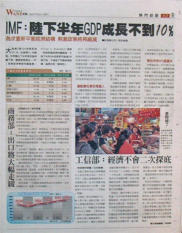 大陸第2季GDP成長率為10.3%,比首季11.9%略降,外界關注下半年是否會持續下滑。國際貨幣基金(IMF)首席經濟學家布蘭查德(Olivier J. Blanchard)認為,財政刺激政策持續縮減,大陸下半年GDP成長率可能連10%都不到;不過為了平衡經濟結構,這是非常「值得的」。