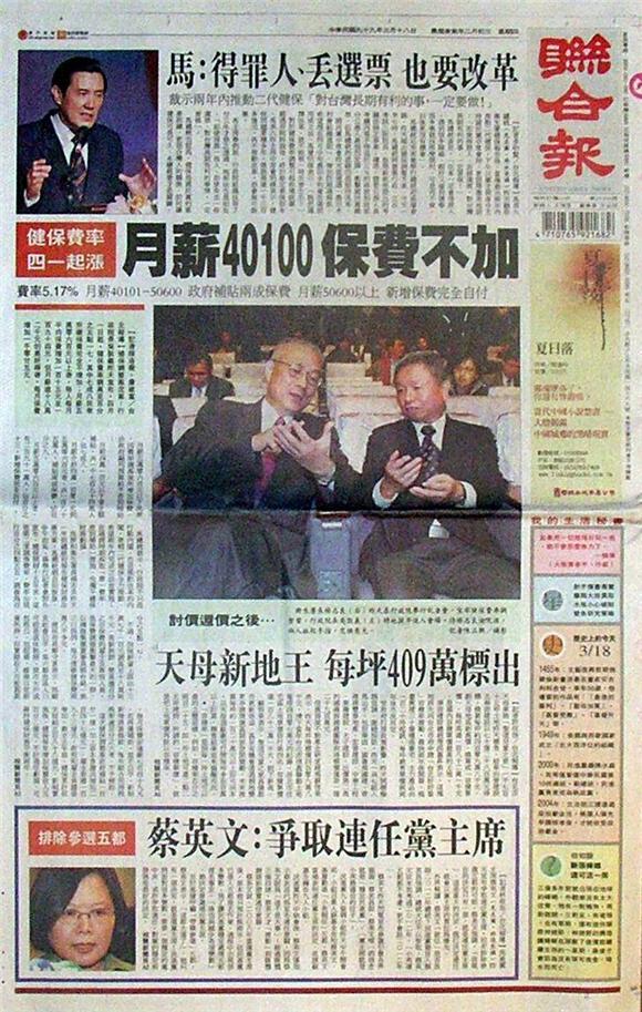 經過連日折衝溝通,八年未調整的健保費,確定四月一日調漲。行政院長吳敦義、衛生署長楊志良十七日宣布,健保將採「單一費率、差別補助」。費率由現行四.五五%調為五.一七%,月薪五萬一四一○元以下可獲政府補助,因此七十八%民眾保費不動。高所得者每月增加上千元,四八七萬人保費調漲。