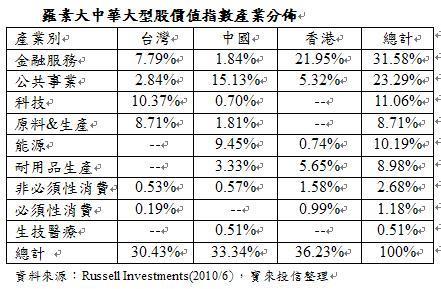羅素大中華大型股價值指數的產業分佈上,前五大產業為金融服務業、公用事業、科技、材料加工及能源,其權重分別依序是31.58%、23.29%、11.06%、10.52%、10.19%;就市場別分析,中國以公用事業的15.13%最高,香港則是金融服務業,佔21.95%,台灣則是科技業,佔比為10.37%。至於前十大指數成份股包括中國移動、中國石油股份、新鴻基地產、長江實業、台灣化纖、中電控股、中國石油化工股份、和記黃埔、台灣塑膠、中華電信。