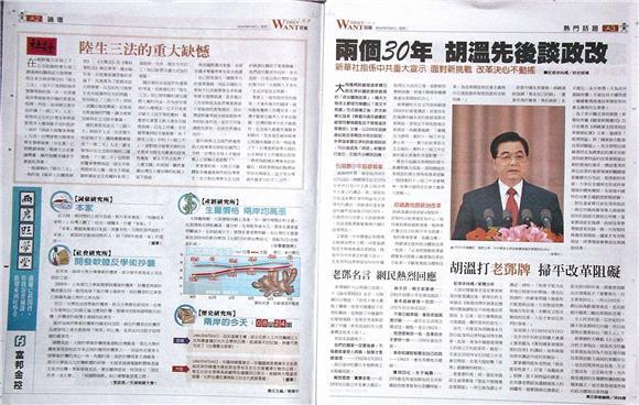 ■兩個30年 胡溫先後談政改 新華社指係中共重大宣示 面對新挑戰 改革決心不動搖