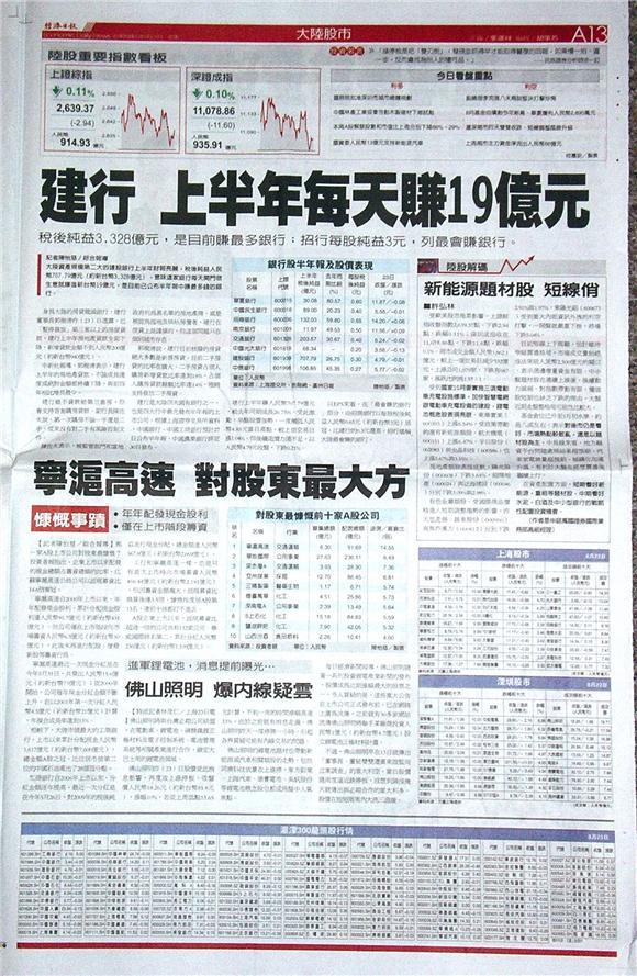 大陸資產規模第二大的建設銀行上半年財報亮麗,稅後純益人民幣七百零七億元人民幣(約新台幣三千三百億元),意味這家銀行每天開門做生意就賺進新台幣十九億元,是目前已公布半年報中賺最多錢的銀行。
