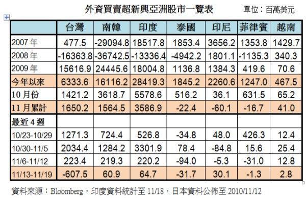 受到愛爾蘭債信風暴影響,加上中國臨時宣布調高存準率的政策,外資終結了連續11週買超新興亞股,獲利了解,其中台股因選舉將屆,市場觀望氣氛瀰漫而遭逢龐大賣壓,單週賣超金額為6.08億美元。