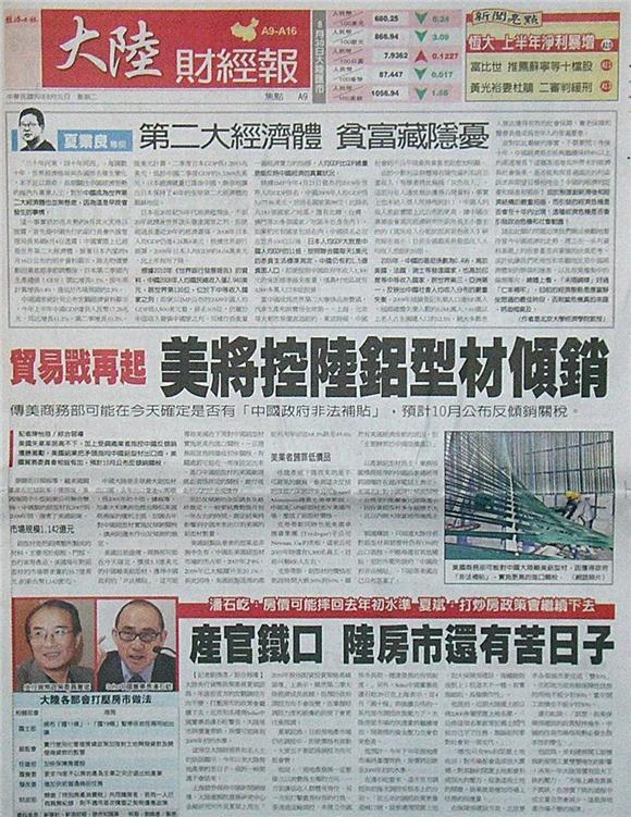 美國失業率居高不下,加上受鋼鐵業者指控中國反傾銷獲勝激勵,美國鋁業把矛頭指向中國鋁型材出口商,美國貿易委員會相挺有加,預計10月公布反傾銷關稅。