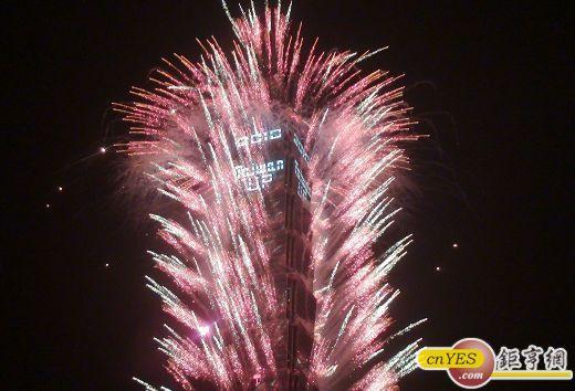 迎接2010年台北101煙火秀還秀出「Taiwan UP」台灣會更好的字樣。(記者:王定傳)