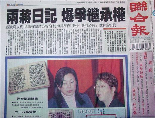 「兩蔣日記」引爆蔣家兩代跨海爭繼承權大戰!蔣家第四代蔣友梅跨海發律師函,主張自己是兩蔣日記法定繼承人之一,要求嬸嬸蔣方智怡出面,協助與胡佛研究所重新簽訂合約,否則將採取法律行動