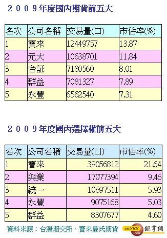 根據台灣期貨交易所統計,去年國內期貨市佔前3名,依次為:寶來集團(包含寶來自營、寶來曼氏期貨 (6023-TW)、寶來曼氏自營3方面全年合計市佔率)13.87%、元大金11.84%、台証8.01%。至於選擇權市佔前3名,分別為:寶來集團(包含寶來自營、寶來曼氏期貨、寶來曼氏自營3方面全年合計市佔率)21.64%、興業9.46%、統一5.93%。
