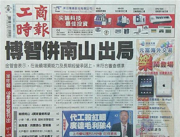 銀行太大以致不能倒,台灣的外商壽險公司是太大以致賣不掉!經濟部投審會昨(31)日正式宣布,博智南山投資控股受讓南山壽股權案,因目的主管機關,亦即金管會未同意,因此投資案未通過。