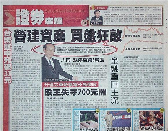 新台幣持續強勢升值,點火資產營建股追價買盤狂敲。受到台幣兌美元匯價今天盤中最高一度來到30.976元帶動,資金大舉由電子股抽離,轉進資產營建股避險,整體營建類股指數盤中漲幅一度達2%來到324點,創2008年6月以來新高。