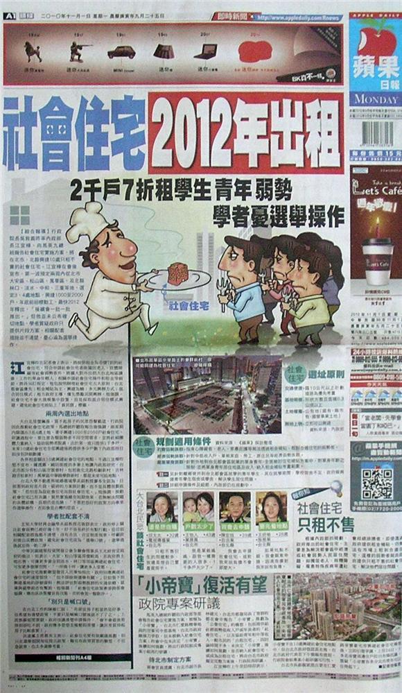 行政院長吳敦義昨率內政部長江宜樺,向馬英九總統報告社會住宅實施方案,將在北市、北縣興建10處只租不賣的社會住宅。江宜樺在會後宣布,第一波預定兩周內從北市大安區、松山區、萬華區,及北縣林口、淡水、中和、三重等地,選定3、4處地點,興建1000至2000戶,年底前招標動工,最快2012年釋出,「後續會一批一批推出。」但他並未公布確切地點。學者質疑政府只提供片段方案,相關配套措施並不清楚,憂心淪為選舉操作。