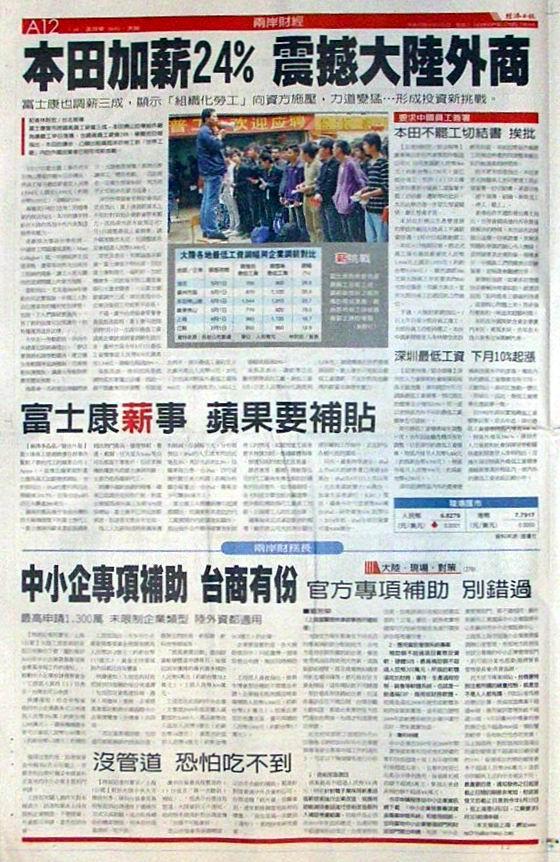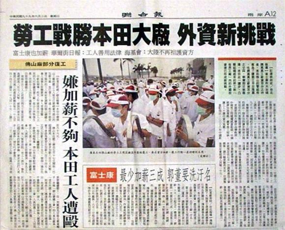 富士康宣布將調高員工薪資三成,本田佛山的零組件廠為讓罷工早日落幕,也調高員工薪資24%。華爾街日報指出,本田的讓步,凸顯出組織起來的勞工對「世界工廠」內的外國投資者已經形成新挑戰。
