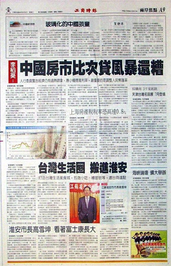 目前正在台灣訪問的江蘇淮安市長高雪坤昨表示,此趟來台有兩大目的,一是感謝在淮安投資的台商企業,二是向台灣民眾推介淮安,同時期盼更多台灣製造業、服務業能到淮安發展。除此,高雪坤昨還特別讚揚淮安富士康,稱其不僅擁有良好的員工工作、生活環境,員工對企業更有一份向心力。