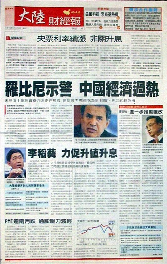 之前曾準確預測到全球金融危機,而被市場稱呼為「末日博士」的紐約大學教授羅比尼1日警告,中國、印度和巴西的經濟可能過熱,資產泡沫正在形成。
