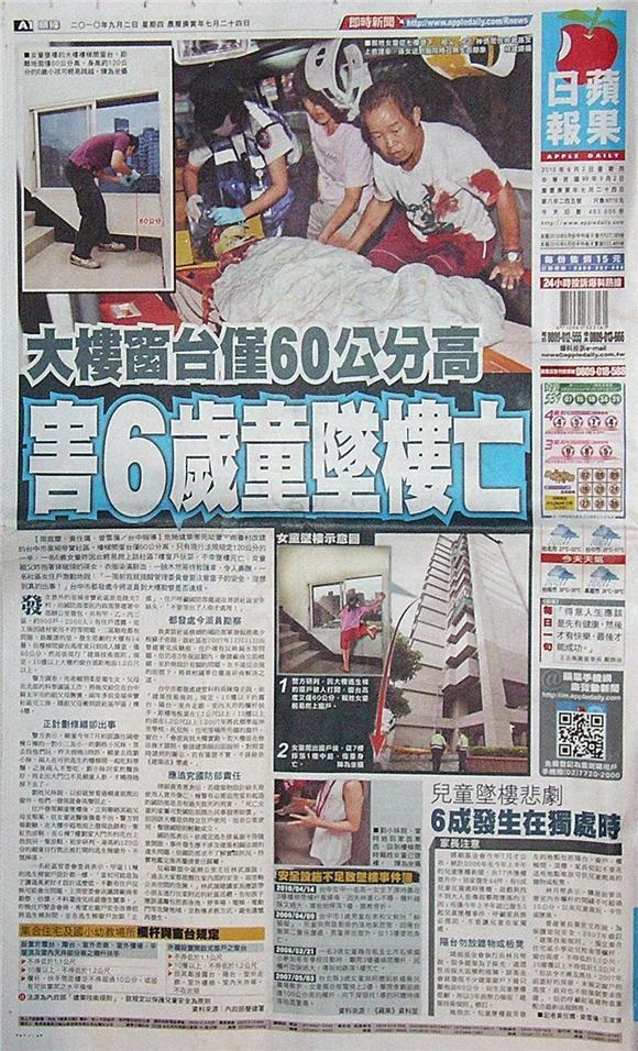 ◆蘋果日報:大樓窗台僅60公分高 害6歲童墜樓亡